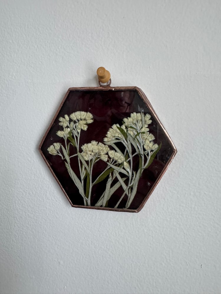 4" hexagon with pressed pearly everlasting flowers and a copper patina