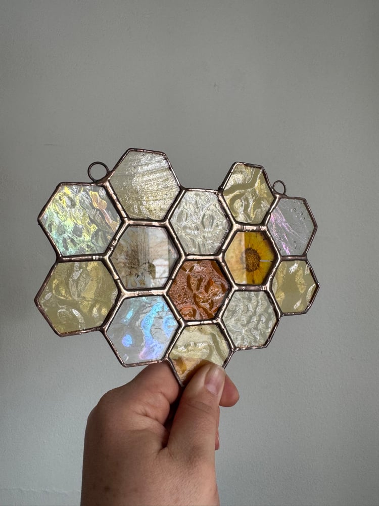13 hexagons make up this honeycomb cluster with pressed flowers and a copper patina
