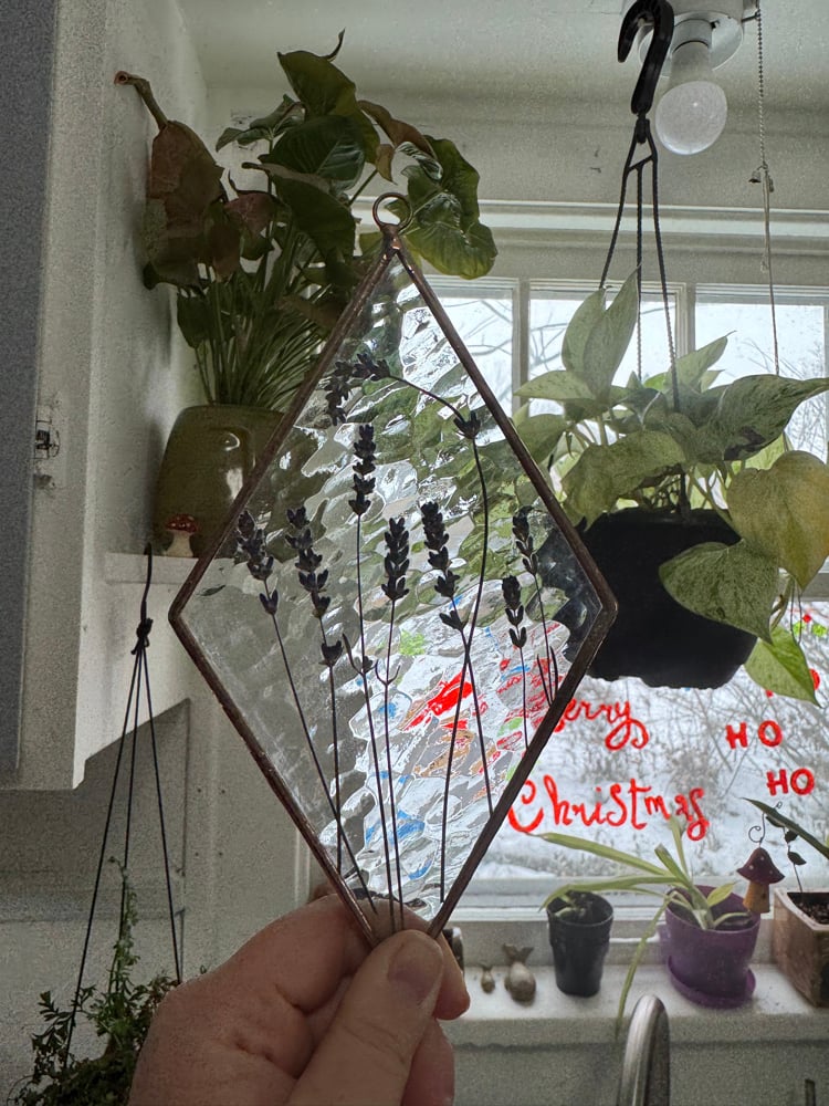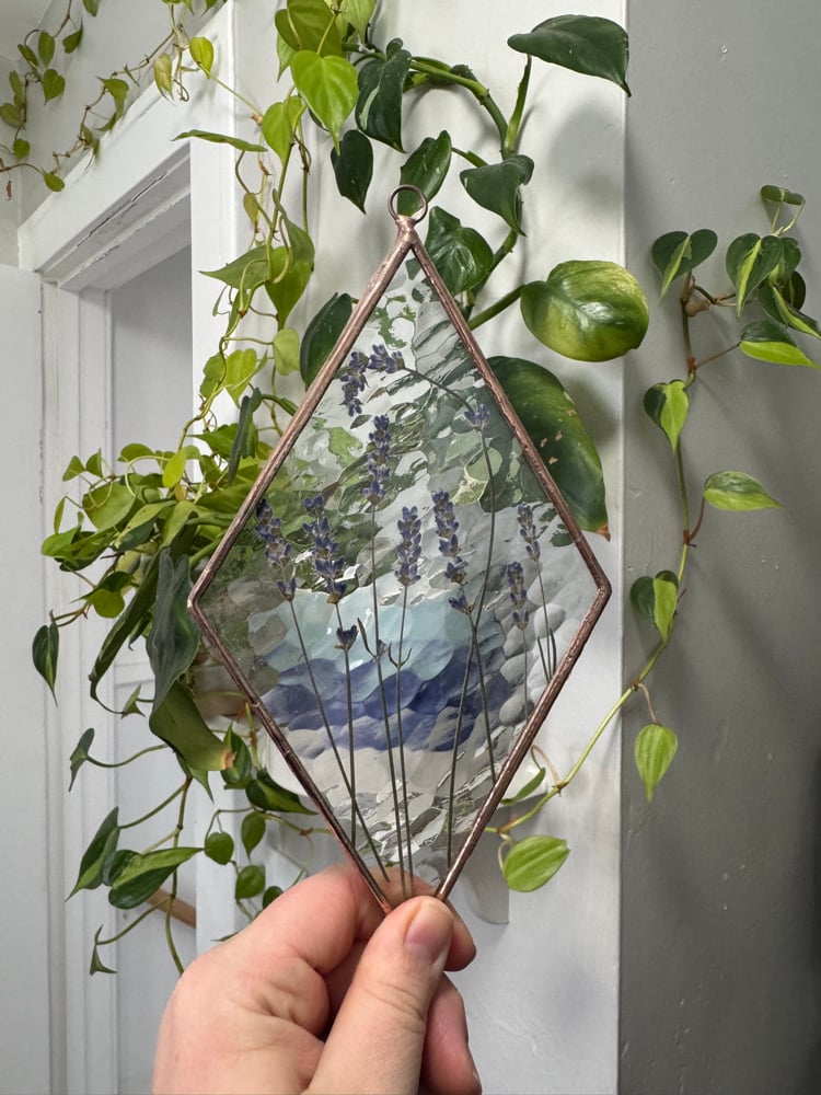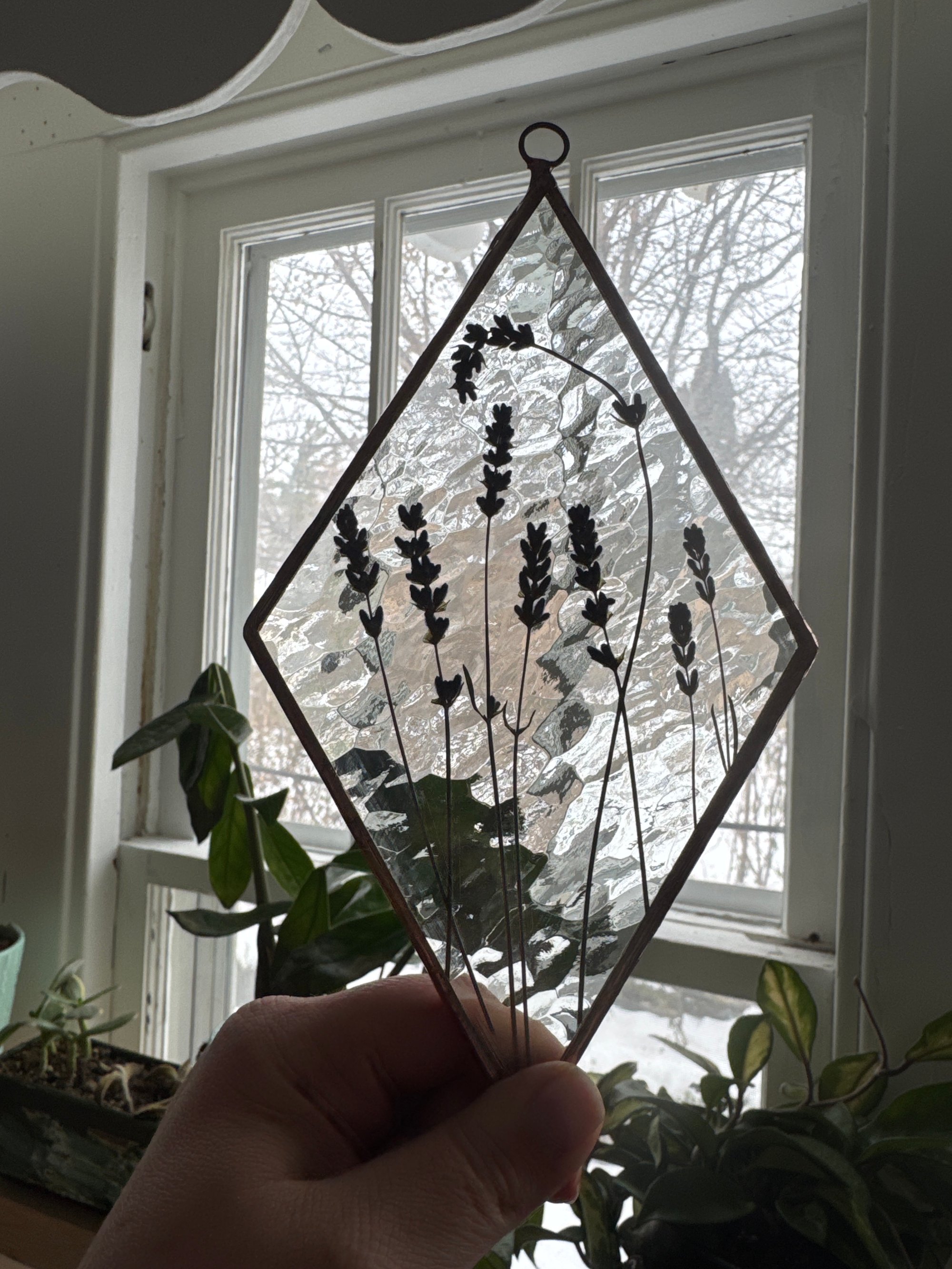 Hand picked and pressed botanicals inside soldered diamond shaped stained glass art piece approximately 4.5 x8 inches with pressed Lavender flowers and clear wavy glass backing, finished with copper patina