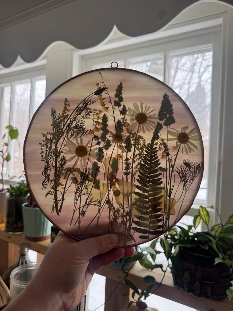 10” round glass piece with pressed wildflowers and a copper patina finish