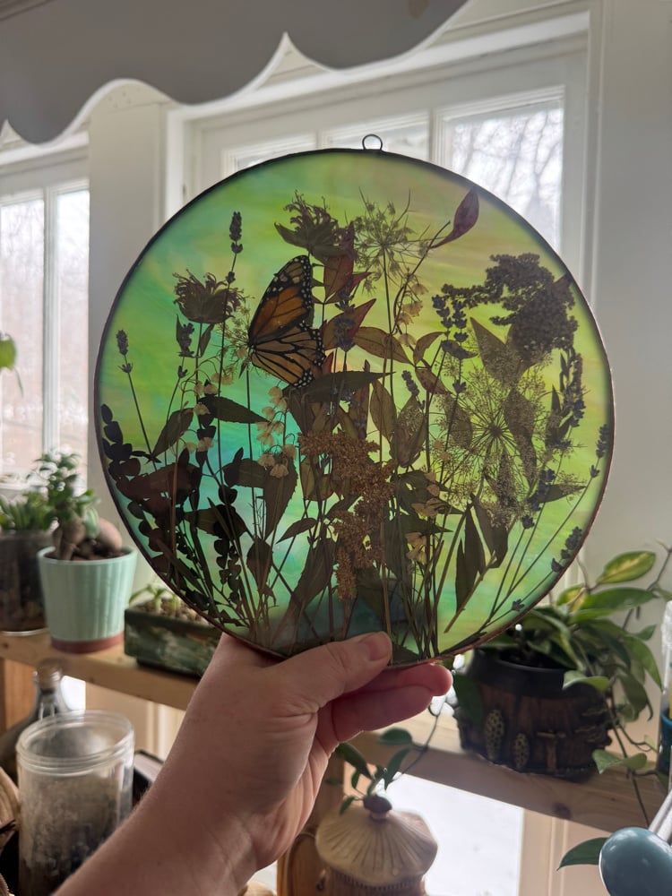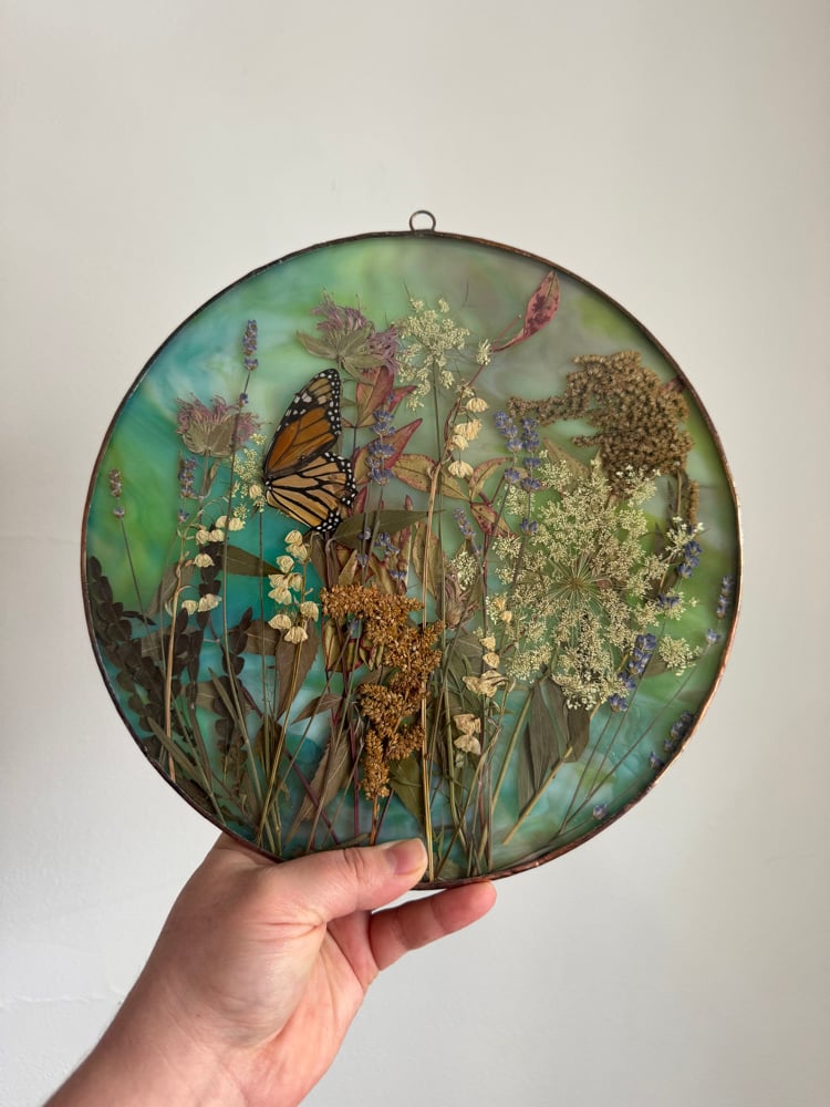 10” round glass piece with pressed wildflowers, real monarch wings and a copper patina finish